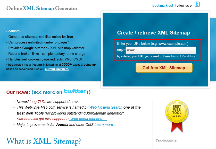 홈페이지 주소를 입력하신 뒤 "Get free XML Sitemap"을 클릭합니다.