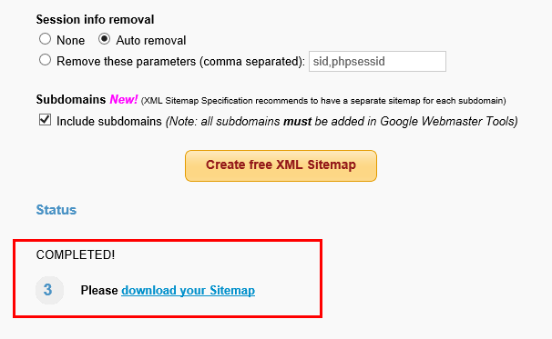 위 이미지에 체크 된 대로 체크하신 후 "Create free XML Sitemap"클릭합니다.