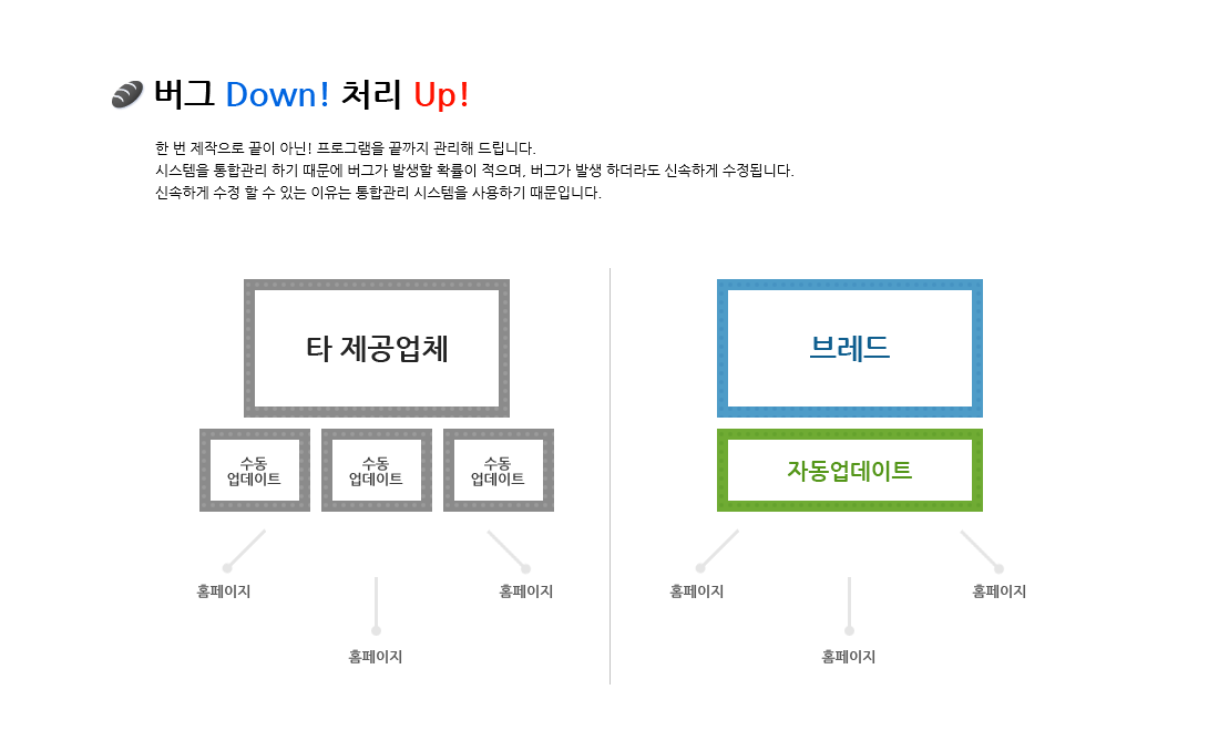 시스템을 통합관리 하기 때문에 버그가 발생할 확률이 적으며, 버그가 발생 하더라도 신속하게 수정됩니다.